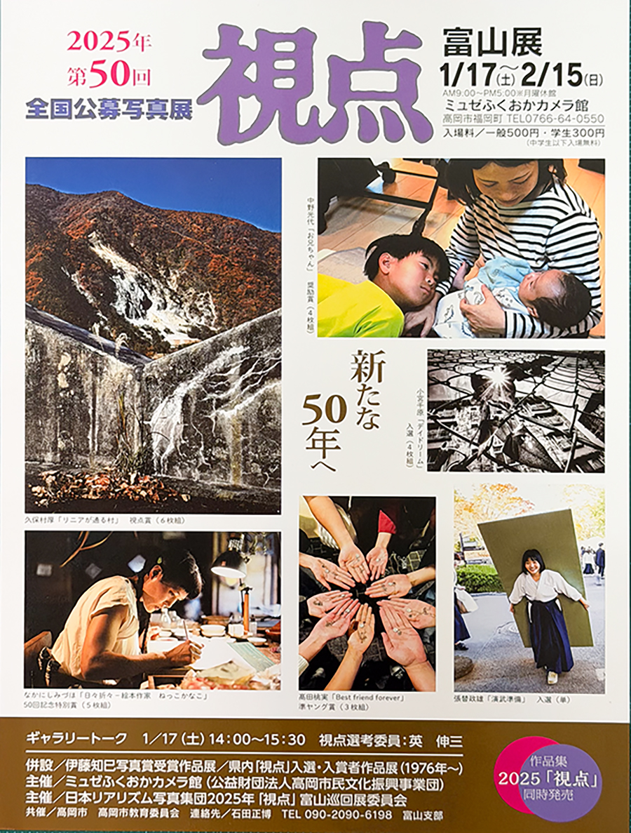 2025年 第50回全国公募写真展「視点」 富山展 site 2025年12月26日2025年12月26日 ミュゼふくおかカメラ館 高岡市福岡町 TEL 0766-64-0550 開催日 2026.1.17(土)〜2.15(日) 入場料 一般500円 学生300円(中学生以下無料)